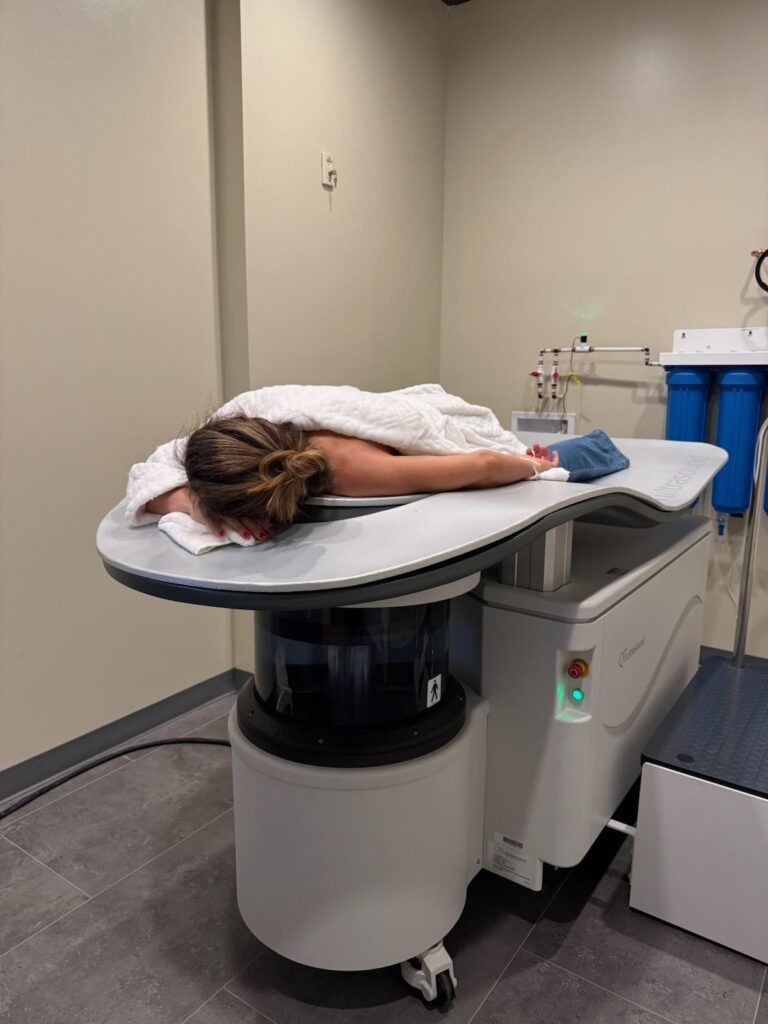 Next, Amanda had me lie face down on my stomach, positioning my right breast into the scanning area. The surface is firm but surprisingly comfortable, with only minor pressure on the ribs. She attached a painless adhesive and small magnet to my breast, then gently lowered me into the warm water for the 13-minute scan per side. (Pro Tip: Be prepared to stay as still as possible. The soothing warmth and gentle movement of the scan will help!)